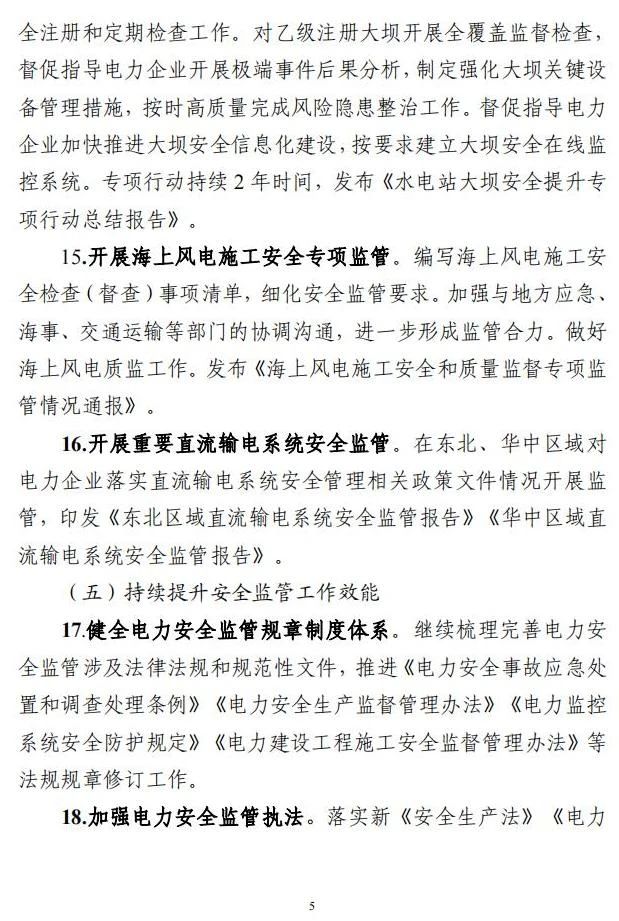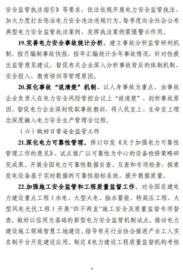 加強(qiáng)施工安全監(jiān)管和工程質(zhì)量監(jiān)督工作。對(duì)全國(guó)在建電力建設(shè)重點(diǎn)工程(水電、大型火電、抽水蓄能、特高壓工程、大型風(fēng)電光伏工程)開(kāi)展“四不兩直”施工安全及質(zhì)量監(jiān)督專項(xiàng)督查。做好以信用為基礎(chǔ)的新型電力安全監(jiān)管機(jī)制試點(diǎn)。