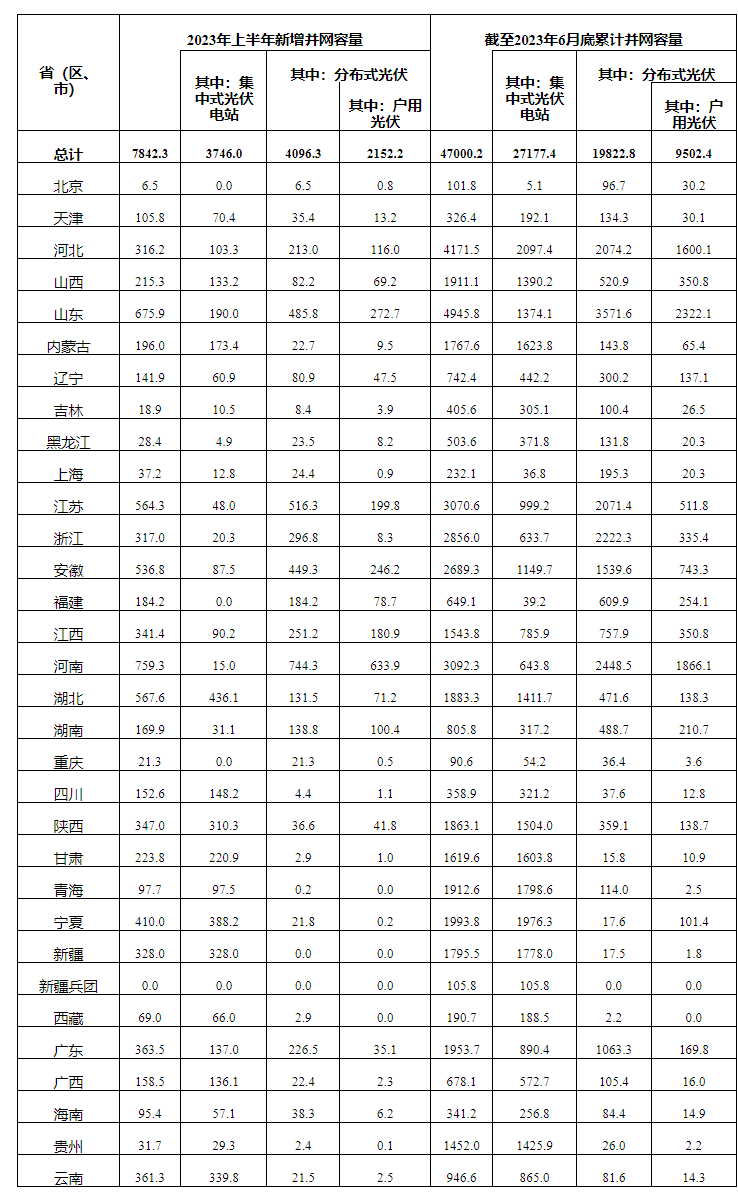 國家能源局7月27日發(fā)布的光伏發(fā)電建設(shè)運(yùn)行情況顯示,2023年上半年新增并網(wǎng)容量7842.3萬千瓦,其中集中式光伏電站為3746萬千瓦,分布式光伏為4096.3萬千瓦。