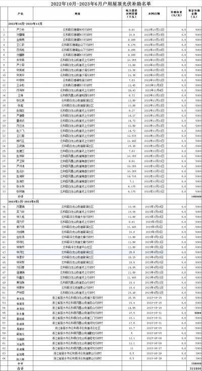 根據(jù)《關(guān)于戶用光伏發(fā)電項(xiàng)目補(bǔ)助有關(guān)事項(xiàng)的通知》(云發(fā)改辦〔2021〕79號(hào))文件精神,2022年10-2023年6月的戶用光伏項(xiàng)目業(yè)主向縣發(fā)改局申請了資金補(bǔ)助,縣發(fā)改局與電力部門進(jìn)行了核對后,確定了補(bǔ)助名單和金額?,F(xiàn)將補(bǔ)助名單和補(bǔ)助金額進(jìn)行公示,詳見附表。