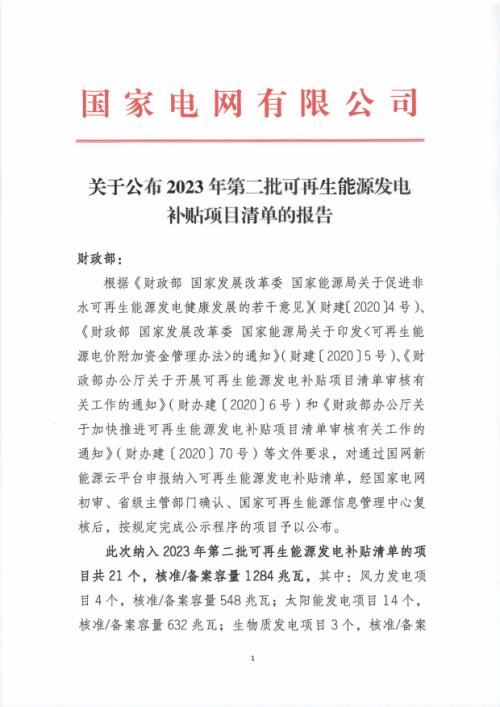 關(guān)于公布2023年第二批可再生能源發(fā)電補(bǔ)貼項(xiàng)目清單的報告