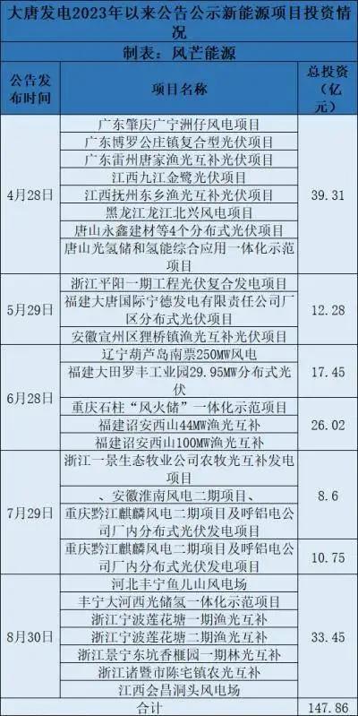 根據(jù)公開信息不完全統(tǒng)計,2023年以來,大唐發(fā)電共發(fā)布5個新能源項目投資計劃公告。其中,風(fēng)、光項目共計27個,總投資超147.86億元。
