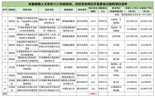 本次納入天津市2023年風(fēng)電、光伏發(fā)電項(xiàng)目共計(jì)10個,規(guī)模總計(jì)2384.1MW,其中,風(fēng)電項(xiàng)目7個,規(guī)模總計(jì)1528.1MW;光伏項(xiàng)目3個,規(guī)??傆?jì)856MW。