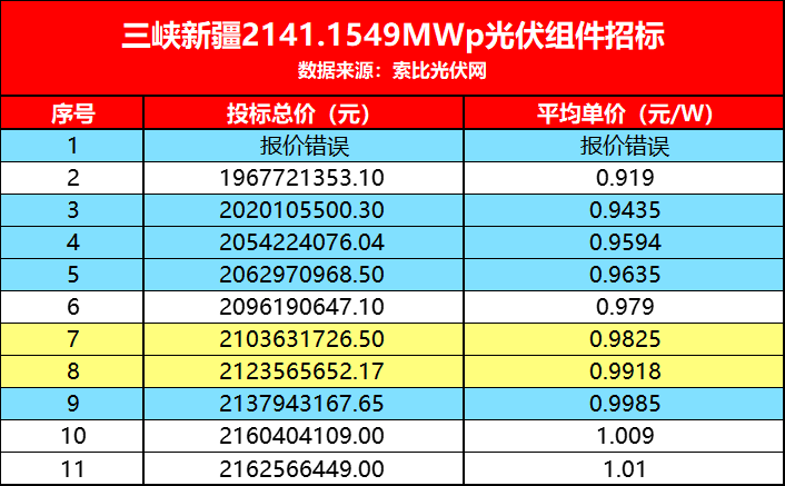 “瘋狂”的并不只有這一家企業(yè)。據(jù)悉,共11家企業(yè)參與這一項目投標(biāo),除一家企業(yè)報價明顯錯誤外,其余10家企業(yè),有8家都投出1元/W以下的價格,整體均價僅0.9756元/W,這是行業(yè)內(nèi)首次出現(xiàn)n型組件平均價低于1元/W的大型招標(biāo),值得所有光伏人關(guān)注和思考。