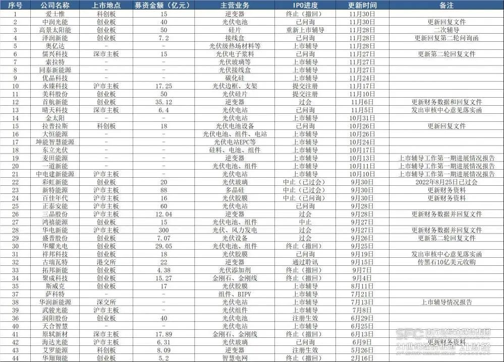 如今,光伏賽道的IPO正在進入“冷靜期”。21世紀(jì)經(jīng)濟報道記者注意到,從啟動IPO工作的企業(yè)數(shù)量上看,光伏行業(yè)在2023年依然活躍。只不過隨著一家又一家企業(yè)中途退出或停滯,整個行業(yè)的IPO氛圍大不如前。