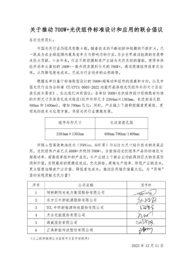 12月11日阿特斯陽(yáng)光電力集團(tuán)、東方日升、TCL中環(huán)、天合光能、通威股份、正泰新能等公司發(fā)布聯(lián)合倡議,推動(dòng)700W+光伏組件標(biāo)準(zhǔn)設(shè)計(jì)和應(yīng)用。倡議提出,各單位700W+光伏組件設(shè)計(jì)延續(xù)既有標(biāo)準(zhǔn)的外形尺寸及安裝孔技術(shù)規(guī)范(組件外形尺寸2384mm×1303mm,長(zhǎng)邊安裝孔距400mm和1400mm),增加790mm孔位;同時(shí),產(chǎn)業(yè)鏈上下游積極探索更高效、更領(lǐng)先的技術(shù)與應(yīng)用方案,共促光伏行業(yè)健康發(fā)展。
