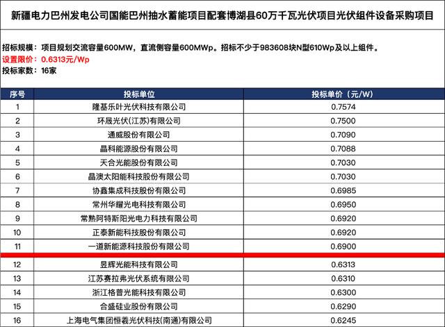記者了解到,上述采購項(xiàng)目的投標(biāo)企業(yè)共有16家,11家企業(yè)報(bào)出了高于或與0.69元/W持平的價(jià)格。其中,隆基綠能旗下的隆基樂葉給出了0.7574元/W的最高報(bào)價(jià),一道新能的報(bào)價(jià)為0.69元/W,與協(xié)會(huì)最近一次發(fā)布的組件成本價(jià)一致。