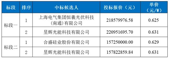 剩余5家企業(yè)報(bào)價(jià)則明顯低于光伏協(xié)會(huì)發(fā)布的組件成本價(jià),報(bào)價(jià)范圍在0.6245元/W—0.6313元/W。上述采購項(xiàng)目兩個(gè)標(biāo)段的中標(biāo)候選人包括上海電氣集團(tuán)恒羲光伏科技(南通)有限公司、昱輝光能科技有限公司以及合盛硅業(yè)。
