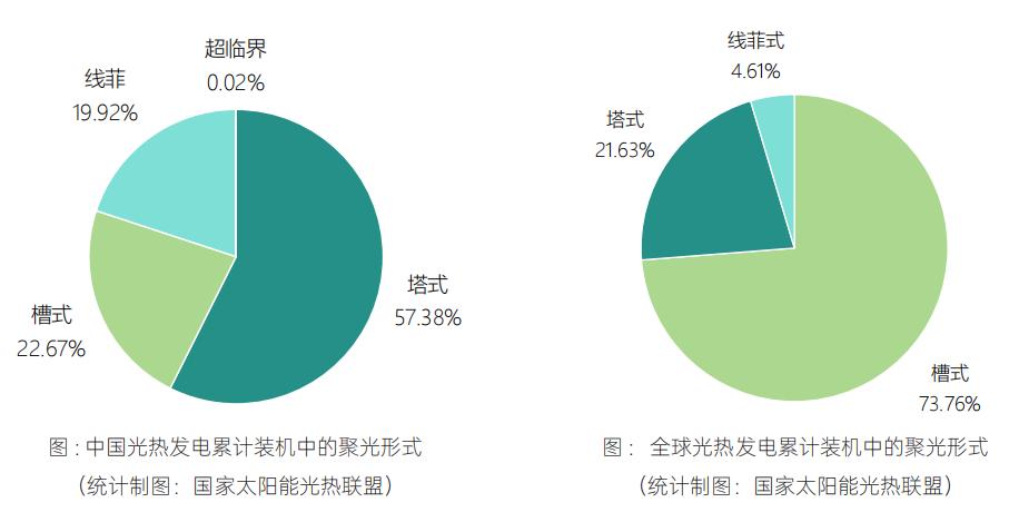 中國(guó)和全球光熱發(fā)電累計(jì)裝機(jī)中的聚光形式