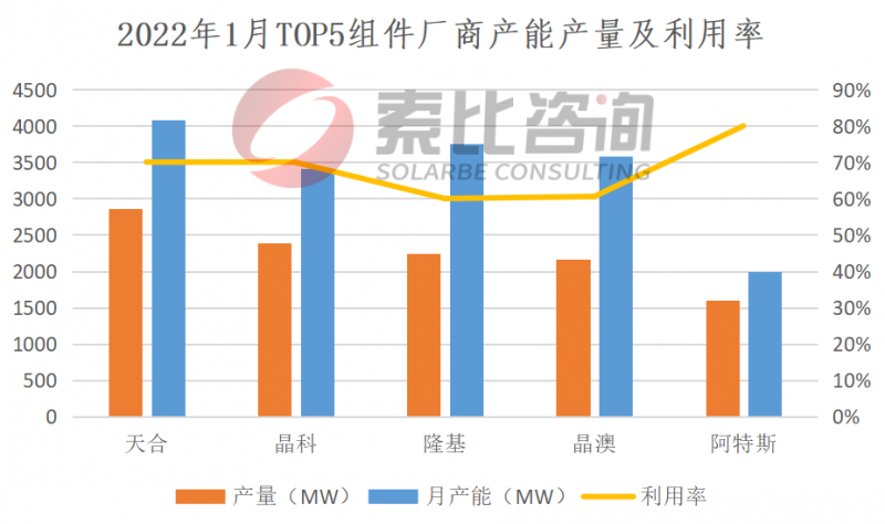 2022年1月,終端需求大幅上升,國內(nèi)組件產(chǎn)量19.73GW,環(huán)比大增23.31%。按照產(chǎn)量排名,天合、晶科、隆基、晶澳、阿特斯位列前五,企業(yè)總產(chǎn)量11.27GW,占比57.12%,綜合開工率68.11%。預(yù)計2022年2月,海外需求還會有所提升,組件產(chǎn)量預(yù)計持平或小幅上漲。