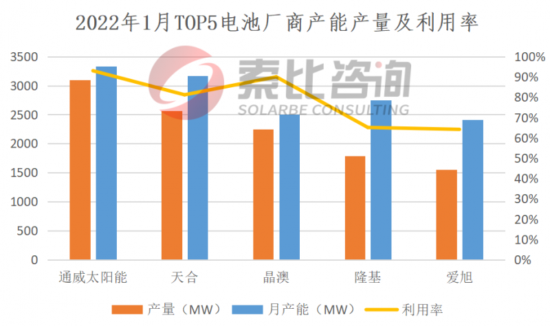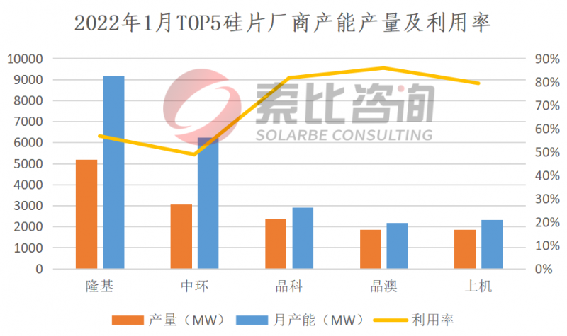 2022年1月,電池需求量明顯增加,國內(nèi)一線企業(yè)開工率提升至7成。2022年1月國內(nèi)硅片產(chǎn)量20.6GW,環(huán)比增加15.4%。按照產(chǎn)量排名,隆基、中環(huán)、晶科、晶澳、上機位列前五,企業(yè)總產(chǎn)量14.34GW,占比69.61%,綜合利用率70.45%。預(yù)計2月份硅片產(chǎn)量將繼續(xù)增加。從供應(yīng)端來看,2月份基礎(chǔ)產(chǎn)量已達(dá)上限,受地震影響的部分產(chǎn)能加緊恢復(fù)。從需求端來看,終端需求遠(yuǎn)超預(yù)期、海外市場火熱,市場轉(zhuǎn)向供不應(yīng)求的局面。
