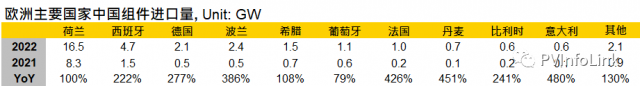目前中國主要出口成長(zhǎng)的區(qū)域市場(chǎng),仍是目前能源轉(zhuǎn)型最積極,同時(shí)也因俄羅斯和烏克蘭沖突下能源供應(yīng)不穩(wěn)定而面臨能源危機(jī)的歐洲。歐洲五月從中國進(jìn)口了8.9GW的光伏組件,同比成長(zhǎng)146%,1 – 5月則是累計(jì)了33.3GW,同比成長(zhǎng)144%,為各區(qū)域市場(chǎng)中成長(zhǎng)最高。2021年歐洲全年進(jìn)口量已經(jīng)是最高的40.9GW,占中國2021年出口的46%,在基期已高且今年仍呈現(xiàn)逐月成長(zhǎng)的態(tài)勢(shì)下,印證了歐洲市場(chǎng)對(duì)于光伏產(chǎn)品的需求仍然強(qiáng)勁。