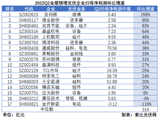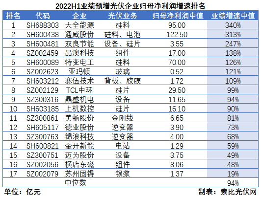 截至7月15日,兩市共有29家光伏企業(yè)發(fā)布2022年半年度業(yè)績(jī)預(yù)告。其中,預(yù)增企業(yè)17家,扭虧企業(yè)5家,預(yù)減企業(yè)3家,預(yù)虧企業(yè)4家。硅料、硅片以及設(shè)備企業(yè)業(yè)績(jī)?cè)鏊倬忧?,而受硅料價(jià)格暴漲影響較大的專(zhuān)業(yè)化電池及組件企業(yè)經(jīng)營(yíng)業(yè)績(jī)則出現(xiàn)顯著分化。