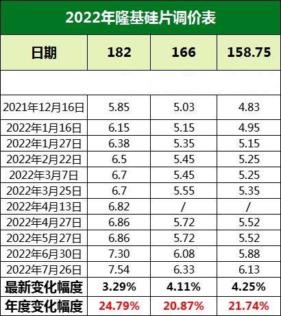 本網(wǎng)訊 7月26日,隆基股份公布了最新一期的硅片價(jià)格,與最近一次(6月30日)的硅片價(jià)格相比,158.75尺寸硅片漲4.25%,定價(jià)為6.13元/W;166尺寸硅片漲4.11%,定價(jià)為6.33元/W;182尺寸硅片漲3.29%,定價(jià)為7.54元/W。與上次調(diào)價(jià)相比,本次隆基股份調(diào)漲幅度明顯收窄。