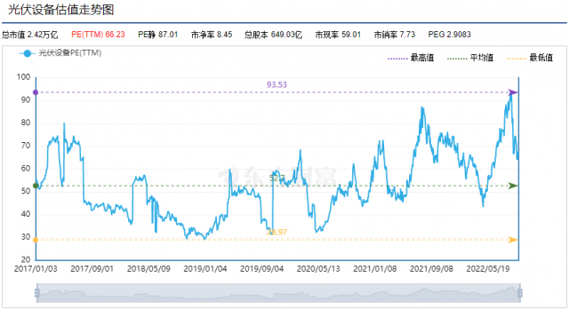 自4月27日以來(lái),光伏板塊全線(xiàn)暴漲,中證光伏產(chǎn)業(yè)指數(shù)最高漲幅高達(dá)79%,股價(jià)翻倍的個(gè)股更是不在少數(shù)。隨著持續(xù)的上漲,光伏板塊的估值水平也“水漲船高”。Choice數(shù)據(jù)顯示,期間光伏板塊的PE(TTM)最高達(dá)到93.53倍,為歷史最高水平。