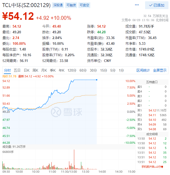 6月28日,TCL中環(huán)(SZ:002129)午后強勢漲停,股價報54.12元/股,總市值達到1749億元,距離歷史前高56.13元/股僅有咫尺之遙!自4月27日低點以來,公司股價漲幅達到61%!