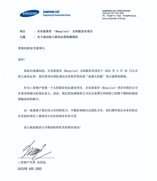 為表示對(duì)晶澳在項(xiàng)目建設(shè)過(guò)程中的大力支持以及對(duì)晶澳高品質(zhì)產(chǎn)品的贊賞和感謝,三星物產(chǎn)在項(xiàng)目建成后特寄來(lái)感謝信,以表謝意。三星物產(chǎn)在感謝信中寫道:“作為三星物產(chǎn)的第一個(gè)太陽(yáng)能發(fā)電站建設(shè)項(xiàng)目,關(guān)島曼基勞項(xiàng)目對(duì)我們公司有著里程碑式的象征意義,因此,我們更加感謝貴公司在從簽署合同到竣工的整個(gè)期間積極而順暢高效的配合。”