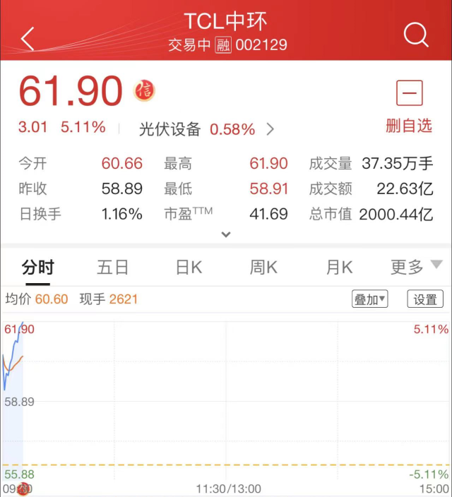 7月1日,TCL中環(huán)(SZ:002129)股價繼續(xù)延續(xù)強勢表現(xiàn),總市值首次突破2000億元!截至上午9時41分,公司股價大漲5.16%,總市值達到2010.63億元!自6月27日以來的五個交易日內(nèi),TCL中環(huán)股價最高漲幅高達33%!