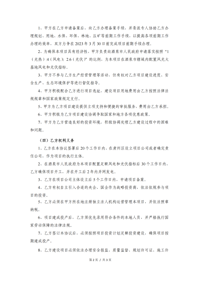 同時為確保本項目具有經(jīng)濟性,酒泉市肅州區(qū)人民政府負責(zé)向酒泉市人民政府申請落實按照“1(光熱):4(風(fēng)電):2.6(光伏)”的比例,為本項目在酒泉市轄域內(nèi)配置風(fēng)光大基地風(fēng)電和光伏指標(biāo)。