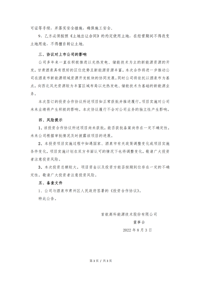 公告顯示,酒泉市肅州區(qū)人民政府在首航高科申請備案后,向首航高科辦理備案手續(xù),并委派專人協(xié)助首航高科辦理規(guī)劃、用地、水保、環(huán)保、林地、壓礦等前期工作手續(xù),以提高各項前期工作辦理的效率,雙方力爭在2023年3月30日前完成項目前期手續(xù)辦理。