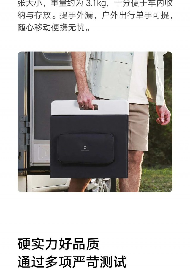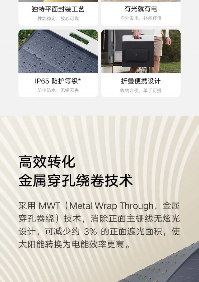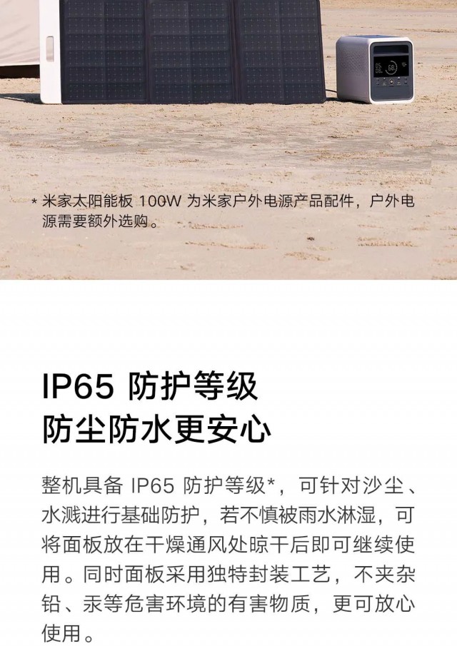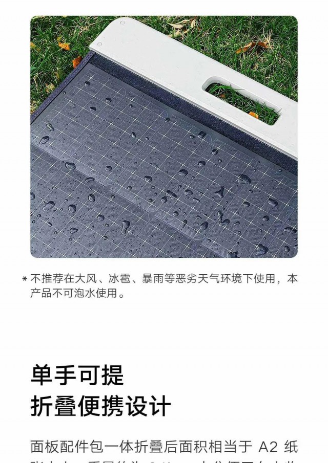 此外,米家太陽能板100W整機(jī)具備IP65防護(hù)等級,可針對沙塵、水濺等進(jìn)行基礎(chǔ)防護(hù)。面板配件包一體折疊后面積相當(dāng)于A2紙張大小,重量約為3.1kg,十分便于車內(nèi)收納與存放。提手外漏設(shè)計(jì),戶外出行單手可提,隨心移動便攜無憂。