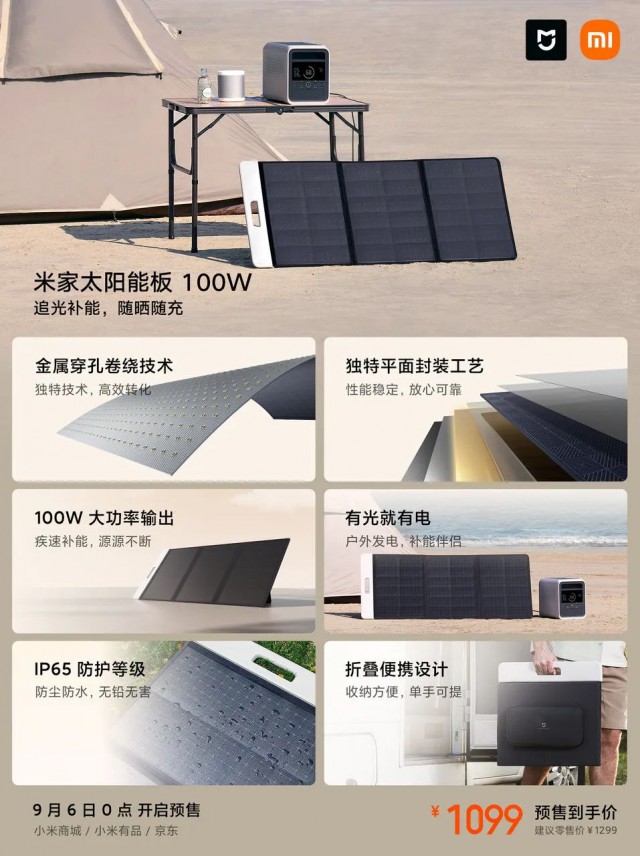 9月6日,小米智能生態(tài)微博官方宣布,米家太陽能板100W開啟定金預(yù)售,建議零售價(jià)1299元,預(yù)售到手價(jià)1099元。