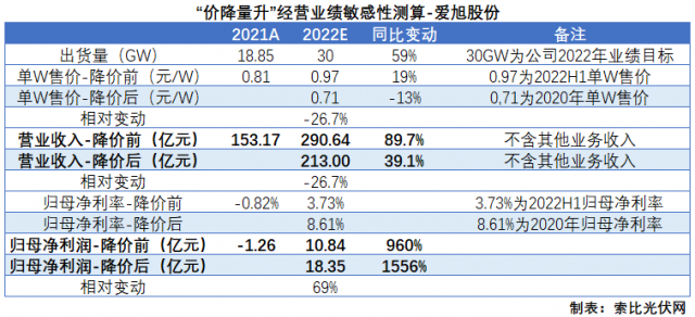 首先來看愛旭股份,假設(shè)2022年電池片單W售價(jià)下降至2020年的水平,同時(shí)盈利能力恢復(fù)至同期水平,按照全年出貨30GW計(jì)算,則營收規(guī)模相比于降價(jià)前下降27%,營收增速由89.7%下降至39.1%。不過,受益于盈利能力的修復(fù),經(jīng)營業(yè)績暴增1556%,相較于降價(jià)前的960%大幅提升。