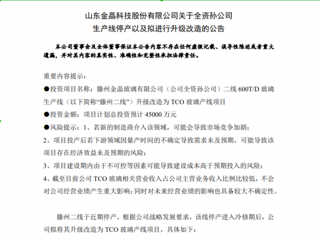 據(jù)悉,在上述運(yùn)營(yíng)期(2012.09-2022.09)內(nèi)該生產(chǎn)線主要產(chǎn)品為浮法玻璃原片,產(chǎn)品定位于建筑、房地產(chǎn)等傳統(tǒng)市場(chǎng)領(lǐng)域。根據(jù)公司未來(lái)業(yè)務(wù)發(fā)展戰(zhàn)略規(guī)劃,以綠色、節(jié)能產(chǎn)品為引領(lǐng),拉伸產(chǎn)業(yè)上下游形成完整產(chǎn)業(yè)鏈,該線停產(chǎn)進(jìn)入冷修期后,公司擬將其升級(jí)改造為600T/D TCO玻璃產(chǎn)線。項(xiàng)目計(jì)劃總投資約4.5億元,建設(shè)周期約8個(gè)月。