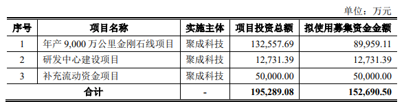 據(jù)悉,本次聚成科技擬募資15.27億元,其中約9億元擬用于年產(chǎn)9000萬公里金剛石線項(xiàng)目、1.27億元用于研發(fā)中心建設(shè)項(xiàng)目、5億元用于補(bǔ)充流動資金項(xiàng)目。