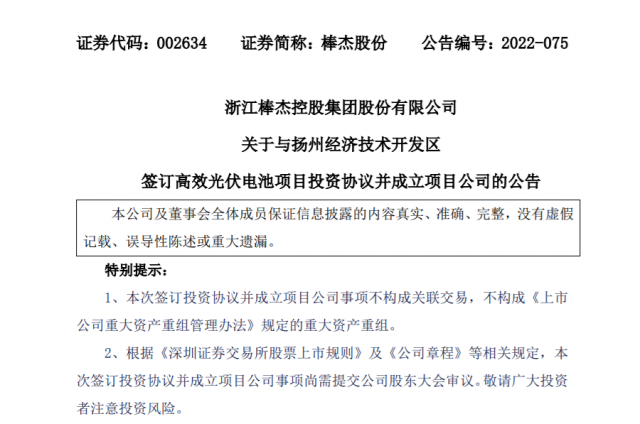 棒杰股份表示結合自身戰(zhàn)略轉型優(yōu)勢及我國光伏產業(yè)快速發(fā)展的機遇,依托戰(zhàn)略股東 光伏領域的豐富經驗和揚州經濟技術開發(fā)區(qū)管委會體制創(chuàng)新、發(fā)展活力及產業(yè)政 策支持,投資建設10GW高效光伏電池片生產基地,實現(xiàn)公司主營業(yè)務向光伏業(yè)的戰(zhàn)略轉型升級,形成新的利潤增長點,為公司業(yè)務發(fā)展提供有力支持,是公司實施戰(zhàn)略發(fā)展的重要舉措,對公司未來發(fā)展具有積極意義和推動作用。