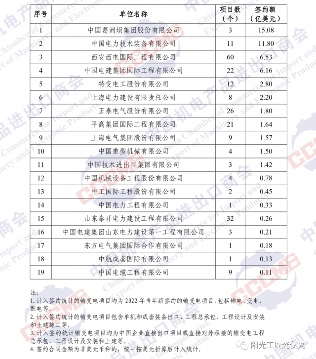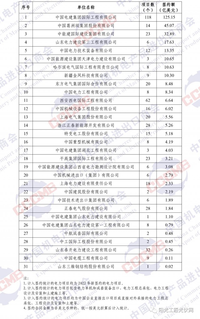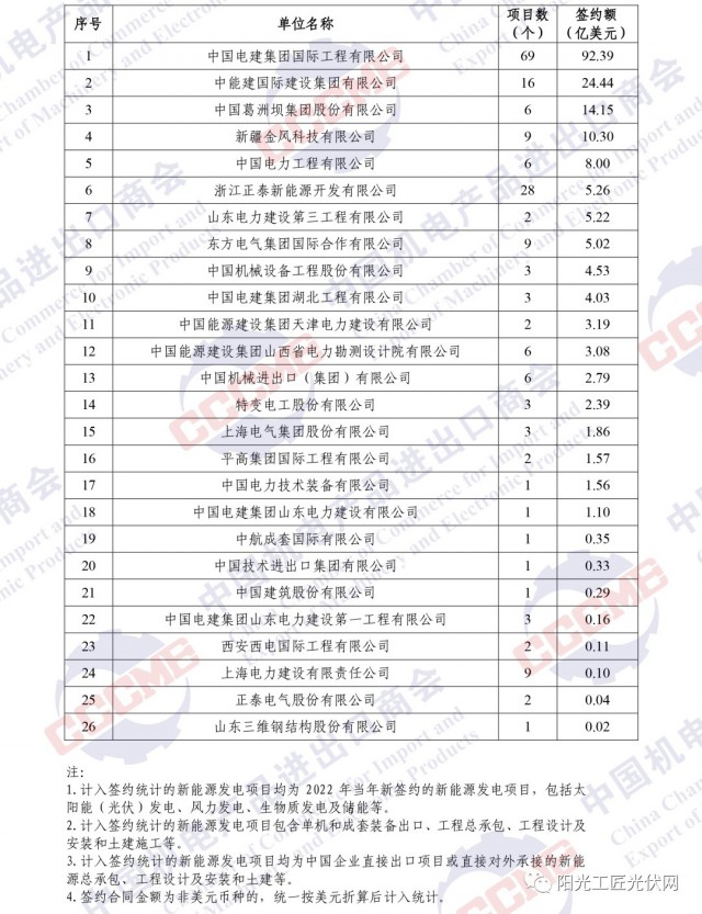 根據(jù)各重點企業(yè)報送的2022年境外電力項目的新簽約情況,中國機電商會對企業(yè)簽約額進行了排名。現(xiàn)將企業(yè)排名及火電、水電、輸變電、新能源(太陽能、風(fēng)、生物質(zhì)、儲能等)及太陽能(光伏)、風(fēng)電行業(yè)簽約排名予以發(fā)布。