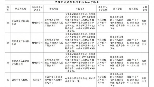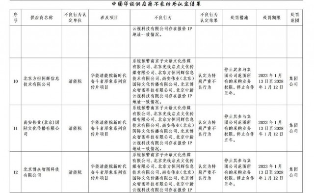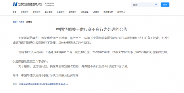 公告稱:為促進(jìn)誠信履約,保證供應(yīng)商產(chǎn)品質(zhì)量、服務(wù)水平,依據(jù)《中國華能集團(tuán)有限公司供應(yīng)商管理辦法》的有關(guān)規(guī)定,對發(fā)生誠信方面問題的供應(yīng)商進(jìn)行了處理。