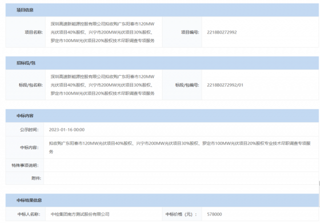 1月30日,深圳高速新能源控股有限公司公示了擬收購廣東陽春市120MW光伏項(xiàng)目40%股權(quán)、興寧市200MW光伏項(xiàng)目30%股權(quán)、羅定市100MW光伏項(xiàng)目20%股權(quán)技術(shù)盡職調(diào)查的中標(biāo)候選人,中檢集團(tuán)南方測(cè)試股份有限公司以57.8萬元的報(bào)價(jià)中標(biāo)。