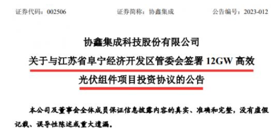 2月15日,協(xié)鑫集成發(fā)布公告稱,該公司擬在江蘇省阜寧經(jīng)濟開發(fā)區(qū)投資建設12GW高效光伏組件項目。