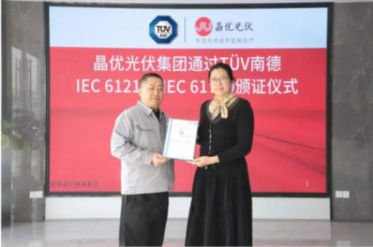 晶優(yōu)光伏集團(tuán)專注光伏組件定制生產(chǎn),致力于向客戶提供從高效光伏組件產(chǎn)品定制化到生產(chǎn)服務(wù)。TÜV南德針對(duì)晶優(yōu)光伏集團(tuán)的單玻和雙玻182/210光伏組件做了IEC 61215、IEC 61730全序列測(cè)試,整個(gè)測(cè)試周期該182、210光伏組件表現(xiàn)良好,最終通過TÜV南德檢測(cè)并收獲TÜV南德認(rèn)證證書。TÜV南德認(rèn)證證書的收獲是對(duì)晶優(yōu)光伏集團(tuán)該款光伏產(chǎn)品設(shè)計(jì)和工廠質(zhì)量保證的雙重認(rèn)可,有力證明了其產(chǎn)品的穩(wěn)定性及可靠性,確保為全球客戶交付高質(zhì)高效的光伏組件。