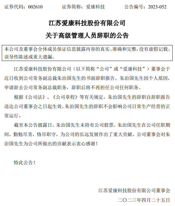 4月24日,愛(ài)康科技(002610.SZ)發(fā)布公告稱(chēng):董事會(huì)于近日收到公司常務(wù)副總裁朱治國(guó)先生的書(shū)面辭職報(bào)告。朱治國(guó)先生因個(gè)人原因,申請(qǐng)辭去公司常務(wù)副總裁職務(wù),辭職后將不再擔(dān)任公司任何職務(wù)。