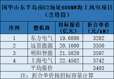上次行業(yè)刷新低價(jià)是在國(guó)家能源集團(tuán)國(guó)華投資山東半島南U2場(chǎng)址600MW海上風(fēng)機(jī)(含塔筒)采購(gòu)項(xiàng)目。該項(xiàng)目共有4家整機(jī)商競(jìng)標(biāo),其中東方電氣報(bào)價(jià)最低,投標(biāo)報(bào)價(jià)為19.69億元,折合單價(jià)為3282元/kW。