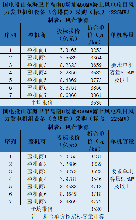 標(biāo)段二(225MW)第一中標(biāo)候選人為明陽(yáng)智能,投標(biāo)報(bào)價(jià)為7.9273億元,折合單價(jià)為3523元/kW。(注:折合單價(jià)按招標(biāo)容量計(jì)算)