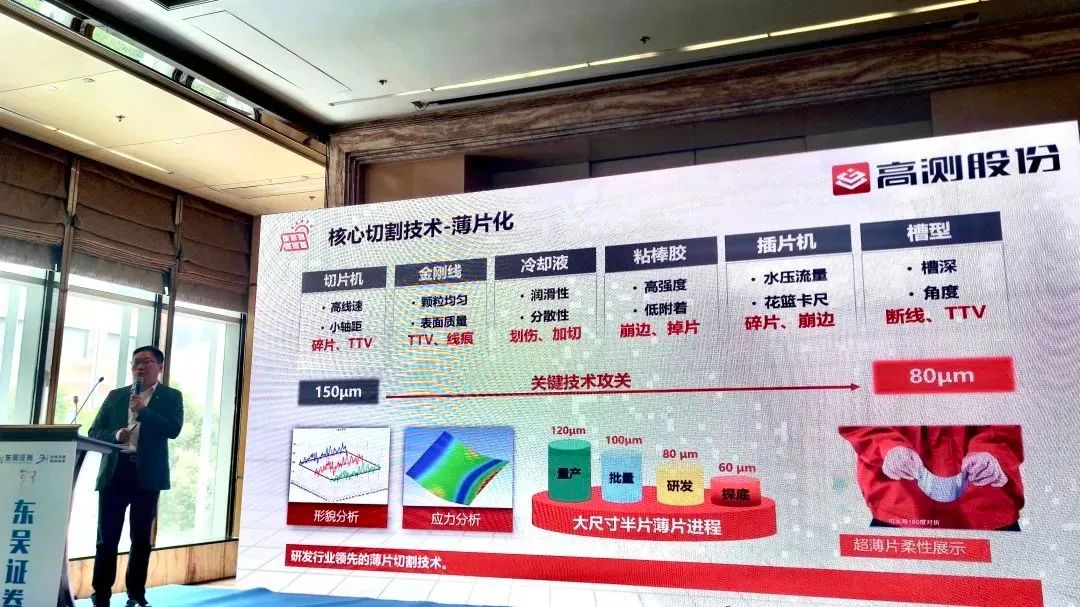 5月12日,高測股份在東吳證券2023年新技術(shù)系列會議上分享了公司的超薄半片硅片進(jìn)展,并首次展示60μm超薄硅片。