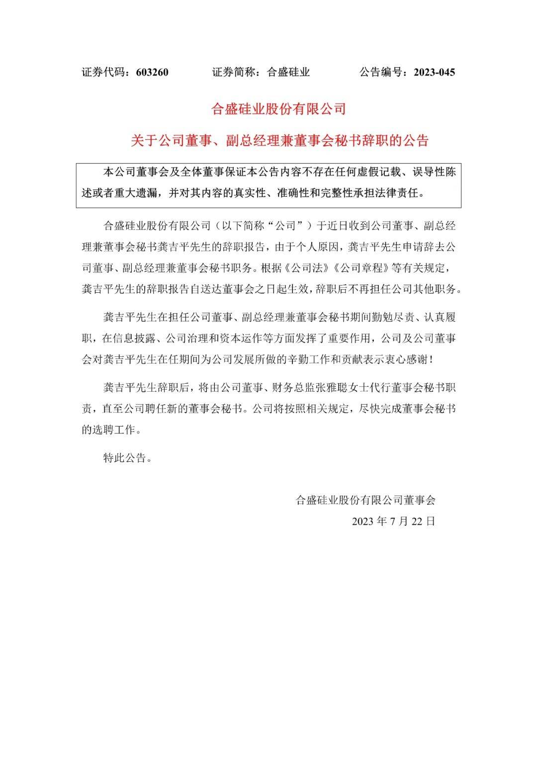 合盛硅業(yè)7月22日發(fā)布公告稱,由于個(gè)人原因,龔吉平申請(qǐng)辭去公司董事、副總經(jīng)理兼董事會(huì)秘書職務(wù)。