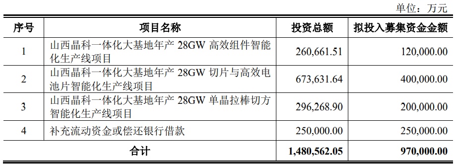 晶科能源向特定對象發(fā)行股票募集資金總額不超過970,000.00萬元(含本數(shù)),扣除相關發(fā)行費用后的募集資金凈額,擬用于山西晶科一體化大基地年產(chǎn)28GW高效組件智能化生產(chǎn)線項目、山西晶科一體化大基地年產(chǎn)28GW切片與高效電池片智能化生產(chǎn)線項目、山西晶科一體化大基地年產(chǎn)28GW單晶拉棒切方智能化生產(chǎn)線項目、補充流動資金或償還銀行借款。