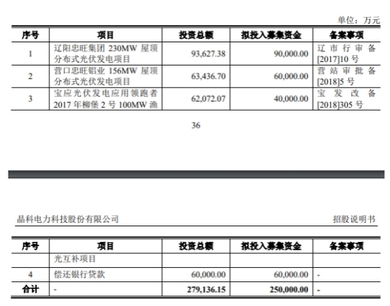 晶科科技發(fā)行募集資金總額為25.98億元,募集資金凈額為24.17億元。晶科科技最終募集資金凈額比原計劃少8324.30萬元。2020年4月25日,晶科科技披露的招股說明書顯示,公司擬募集資金25.00億元,分別用于遼陽忠旺集團230MW屋頂分布式光伏發(fā)電項目、營口忠旺鋁業(yè)156MW屋頂分布式光伏發(fā)電項目、寶應光伏發(fā)電應用領跑者2017年柳堡2號100MW漁光互補項目、償還銀行貸款。