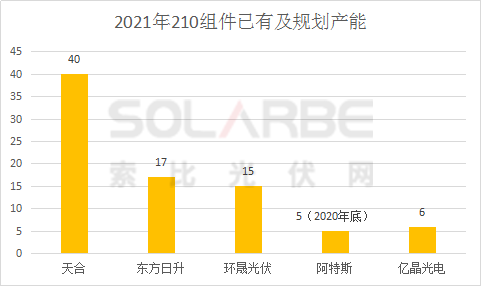 組件端,天合、東方日升、環(huán)晟光伏、阿特斯四家企業(yè)2021年的210組件產(chǎn)能規(guī)劃超83GW。天合在浙江義烏、宿遷、江蘇鹽城建設(shè)了三大210超級(jí)工廠,2020年底天合210組件產(chǎn)能已超22GW,2021年在全球產(chǎn)能將超過(guò)50GW,其中210產(chǎn)能占比超過(guò)80%,在40GW以上。
