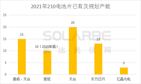 電池片端,通威、天合、愛(ài)旭、東方日升四家企業(yè)2021年的210電池片產(chǎn)能規(guī)劃超61GW。