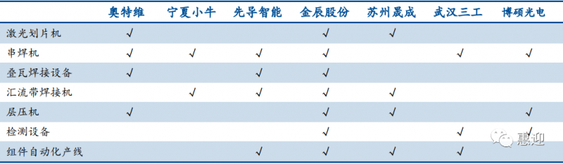 組件設(shè)備的市場較為分散,公司數(shù)量較多,競爭較為充分。組件設(shè)備國產(chǎn)化進程較早,廠商可提供多種產(chǎn)品,充分利用技術(shù)同源和客戶同源優(yōu)勢。如奧特維可提供激光劃片機、串焊機、疊瓦串焊機、層壓機等設(shè)備,先導智能可提供串焊機、疊瓦一體焊接機、匯流條焊接機等設(shè)備,金辰股份可提供激光劃片機、串焊機、疊片焊接機、層壓機、匯流條焊接機、層壓機、EL 測試儀等設(shè)備。同時,先導智能、金辰股份、蘇州晟成、武漢三工還可提供組件自動化生產(chǎn)線。