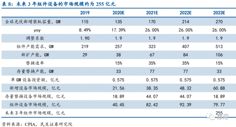 經(jīng)民生證券測算,預計 2021 年、2022 年、2023 年組件設(shè)備的市場規(guī)??煞謩e達到 82.42 億元、92.39 億元和 79.77 億元,未來 3 年組件設(shè)備的市場規(guī)模合計可達 255 億元,組件設(shè)備廠商擁有廣闊的發(fā)展前景。