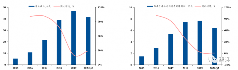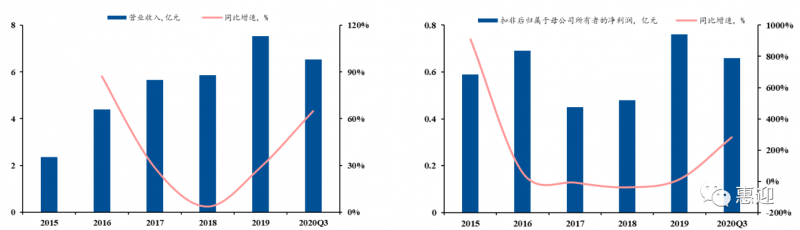 公司是光伏自動化組件設(shè)備的頭部供應商,下游客戶涵蓋國內(nèi)多家知名光伏組件企業(yè),同時積極布局新型組件設(shè)備,向壁壘較高的電池設(shè)備領(lǐng)域延伸,探索新增長點。2015-2019 年,公司業(yè)績大幅增長,營業(yè)收入從 2.92 億元增長至 7.9 億元,CAGR 為 31.08%。截止 2020 年第三季度,公司的歸母凈利潤為 0.65 億元,同比增長 65%,超過 2019 年全年歸母凈利潤。合同負債已達 3.71 億元,為 2021 年業(yè)績奠定良好基礎(chǔ)。2019 年,光伏組件自動化生產(chǎn)線作為公司的主營業(yè)務,占總營收的 93.11%,輔之以串焊機、層壓機等價值量較高的單機設(shè)備。