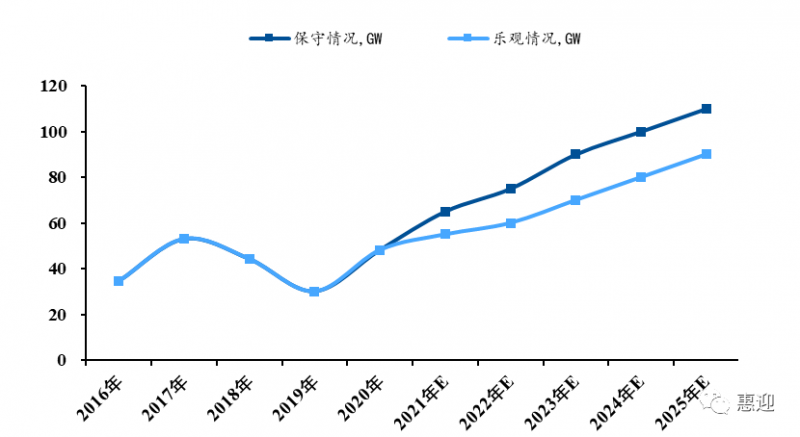 在中國向“30·60目標”邁進的過程中,“十四五”是實現(xiàn)碳達峰的關(guān)鍵時期,光伏發(fā)電大有可為。根據(jù) CPIA的觀察與分析,預計 2021 年新增裝機規(guī)模約為 55GW-65GW,預計“十四五”期間,國內(nèi)年均光伏新增裝機規(guī)模將達 70-90GW。由此推算,未來 5 年,光伏新增總裝機規(guī)模有望達到 350-450GW,同比“十三五”期間 210GW 的新增總裝機規(guī)模有較大幅度提升。