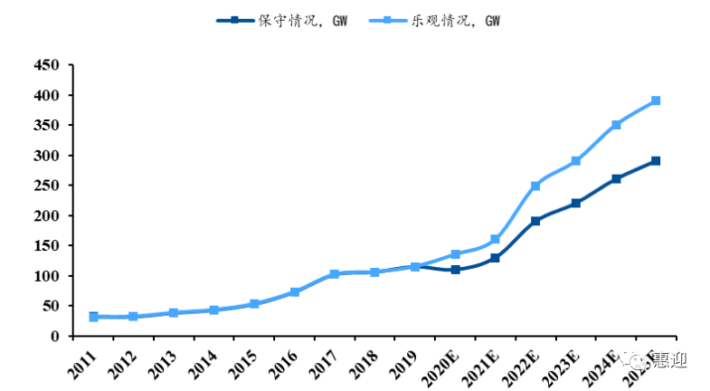 光伏行業(yè)降本提效穩(wěn)步推進,疊加全球各國可再生能源政策的頒布與執(zhí)行,預計全球光伏累計裝機容量將繼續(xù)保持增長態(tài)勢,根據(jù) CPIA 的預測,“十四五”期間,樂觀預期下,全球光伏裝機規(guī)模年均新增 287GW,中性情況下年均新增 222GW。該預期與 IRENA 于 2019 年年在分析報告《光伏的未來》給出的預測基本一致,IRENA 認為,到 2030 年光伏的裝機目標將達到 8500GW,年均光伏新增規(guī)模將超過 250GW。