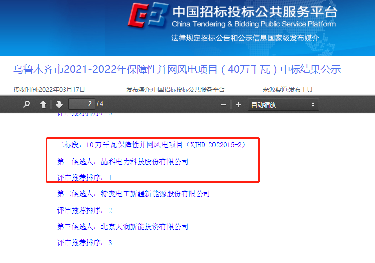 近日,烏魯木齊市2021-2022年保障性并網(wǎng)風(fēng)電項(xiàng)目(40萬千瓦)中標(biāo)結(jié)果公示,晶科科技(601778.SH)憑借領(lǐng)先的技術(shù)及良好的行業(yè)口碑,中標(biāo)了其中10萬千瓦(100MW)規(guī)模的保障性并網(wǎng)風(fēng)電項(xiàng)目。此次中標(biāo),是晶科科技成立以來首次獲得風(fēng)電項(xiàng)目,也是公司推動(dòng)可再生、清潔能源開發(fā)利用之路上新的里程碑,標(biāo)志著公司正式進(jìn)軍風(fēng)電市場(chǎng)。