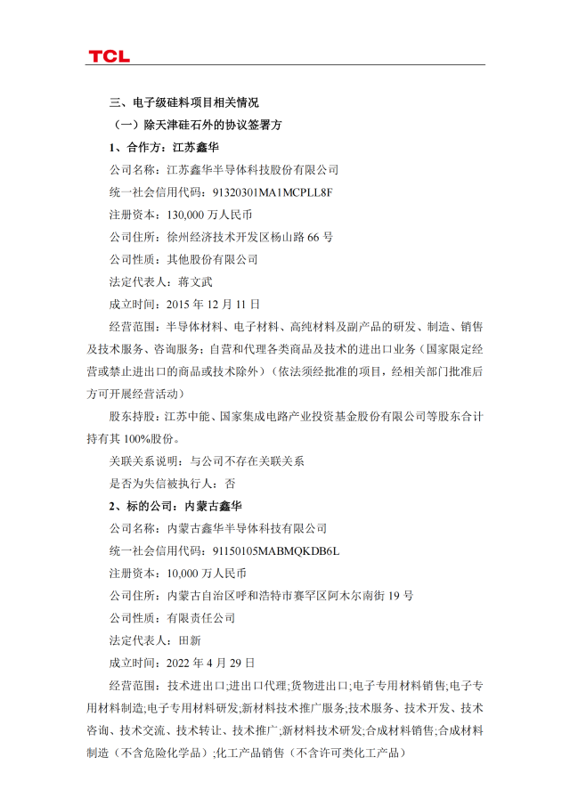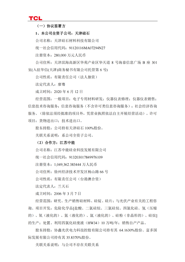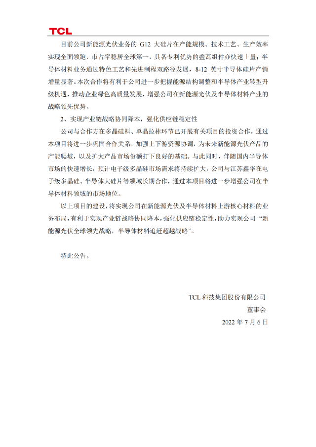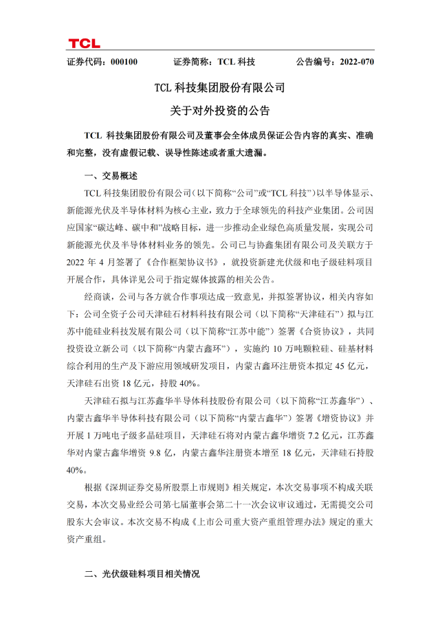 7月7日,TCL科技發(fā)布公告稱,今年4月與協(xié)鑫集團有限公司及關聯(lián)方簽訂《合作框架協(xié)議書》,就投資新建光伏級和電子級硅料項目開展合作。